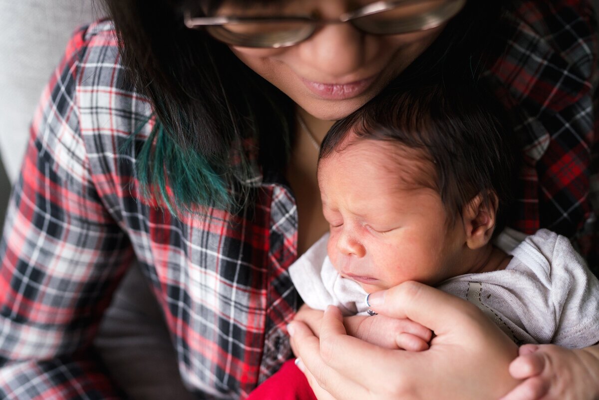 The beauty of lifestyle newborn photography is that it does not matter if your baby is asleep or awake. Not all newborns are sleepy, some just want to see what is going on. However, the entire time they are comfortable and safe in mom or dad’s arms. Whether your baby is asleep or awake and looking around during their Seattle area newborn photo session, your gallery will be full of beautiful images.